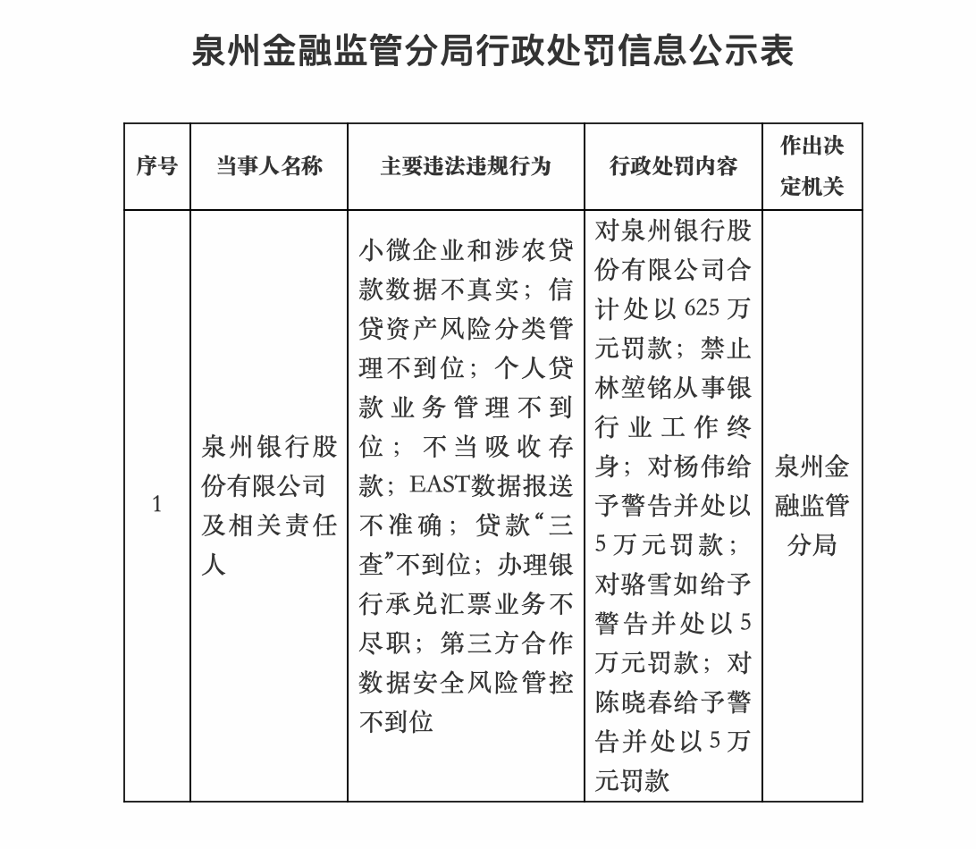 2月14日,泉州金融監(jiān)管分局行政處罰信息公示表顯示,對泉州銀行股份有限公司合計處以625萬元罰款;禁止林堃銘從事銀行業(yè)工作終身;對楊偉給予警告并處以5萬元罰款;對駱雪如給予警告并處以5萬元罰款;對陳曉春給予警告并處以5萬元罰款。泉州銀行主要違法違規(guī)行為包括:小微企業(yè)和涉農(nóng)貸款數(shù)據(jù)不真實(shí);信貸資產(chǎn)風(fēng)險分類管理不到位;個人貸款業(yè)務(wù)管理不到位;不當(dāng)吸收存款;EAST數(shù)據(jù)報送不準(zhǔn)確;貸款“三查”不到位;辦理銀行承兌匯票業(yè)務(wù)不盡職;第三方合作數(shù)據(jù)安全風(fēng)險管控不到位。