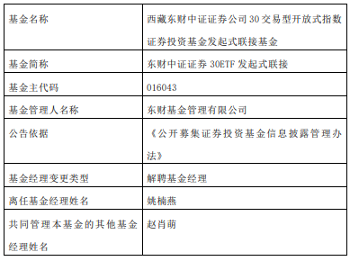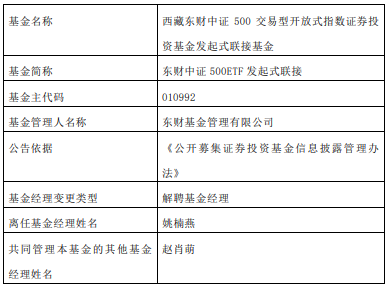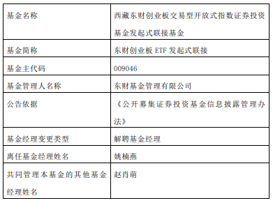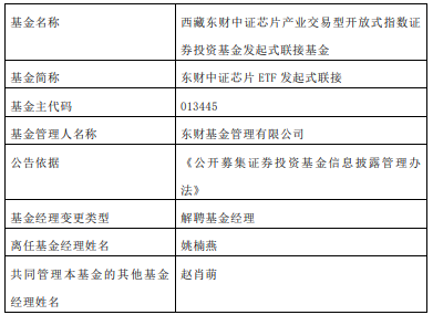 近日,東財(cái)基金公告,姚楠燕離任東財(cái)中證500ETF發(fā)起式聯(lián)接、東財(cái)中證證券30ETF發(fā)起式聯(lián)接、東財(cái)上證50ETF發(fā)起式聯(lián)接、東財(cái)創(chuàng)業(yè)板ETF發(fā)起式聯(lián)接、東財(cái)中證芯片ETF發(fā)起式聯(lián)接。